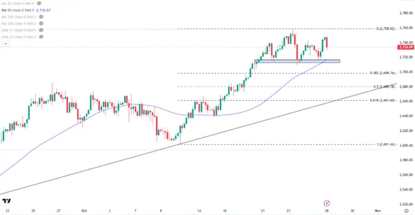 金价上周在2710/15附近止跌,验证了该区域的支撑作用。周线继续收高显示出黄金在当前市场环境中的避险地位,不过涨势有所趋缓。
