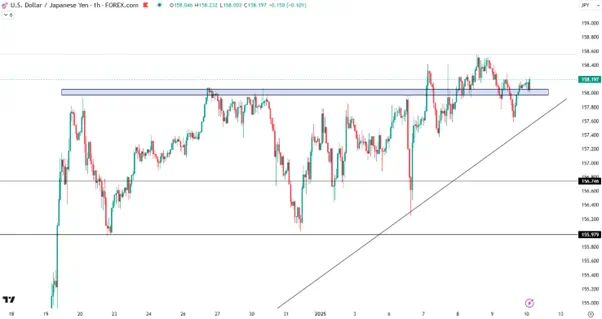 目前多空双方正围绕158一线展开争夺,从12月以来的上升趋势线可能会助USDJPY多头一臂之力。好于预期的非农报告有望帮助汇价稳固158一线并继续上行。反之,或将考验趋势线157.50以及156.75一线的支撑。