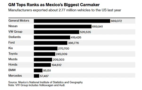 2024年车企通过墨西哥出口至美国的规模 来源:彭博