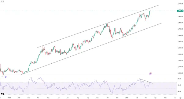 在触及3000美元的心理关口后,部分交易者或许会转而关注获利了结和高位调整的可能性,但目前走势还没有出现反转迹象,宏观风险事件也没有明显好转,因此可以继续关注黄金上行走势的延续。若美联储本周公布鸽派会议声明,有望帮助黄金冲击通道上轨3040/50附近,下行方向的首要参考在2980一线。