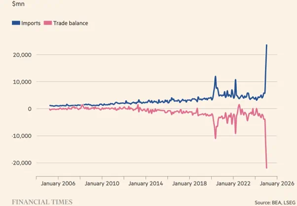 美国从瑞士的进口总额(蓝线)和逆差(红线) 来源:金融时报