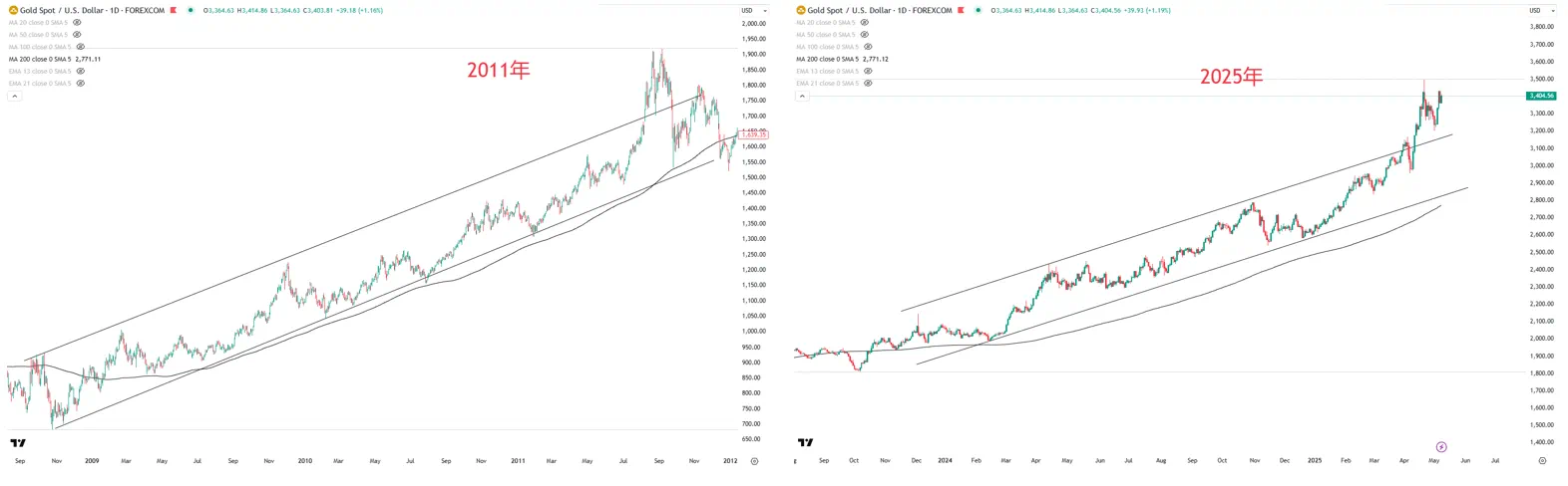黄金走势2011 vs 2025 来源:Tradingview
